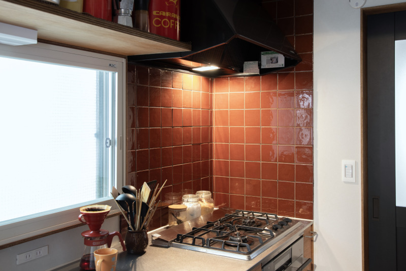 表面も形もでこぼこ不揃いなタイルがつくる、きっちりしすぎない雰囲気が心地よいキッチン。