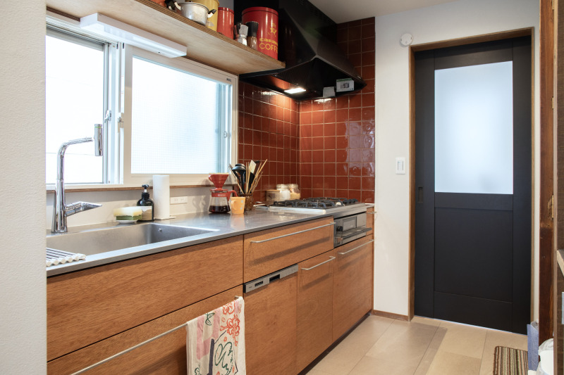 東向きのキッチンは、木製のキッチンを取り入れてあたたかな雰囲気に。赤みがかったブラウンのタイルも、居心地アップのキーアイテム。