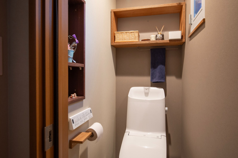 壁はマットな質感のペイント調クロスを貼り、パーツや収納に木を取り入れて、居心地の良いトイレ空間に。