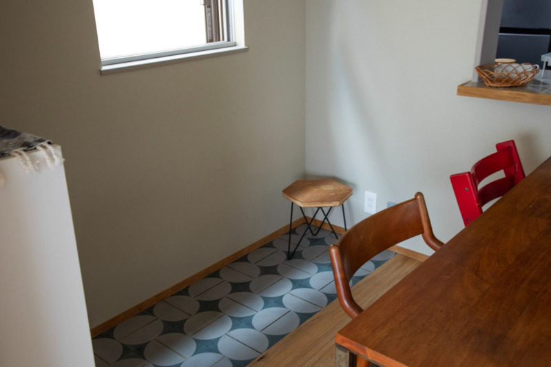 ダイニングのフロアの一部をタイル床にして、ちょっとしたコーナーに。幾何学柄の大判タイルは、ベトナム生まれのセメントタイル。