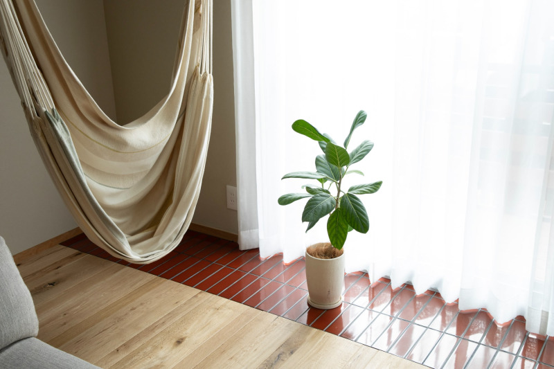 バルコニーに面した窓辺を、艶のあるタイル床に。単純な長方形のリビングダイニングに変化をもたらす工夫。