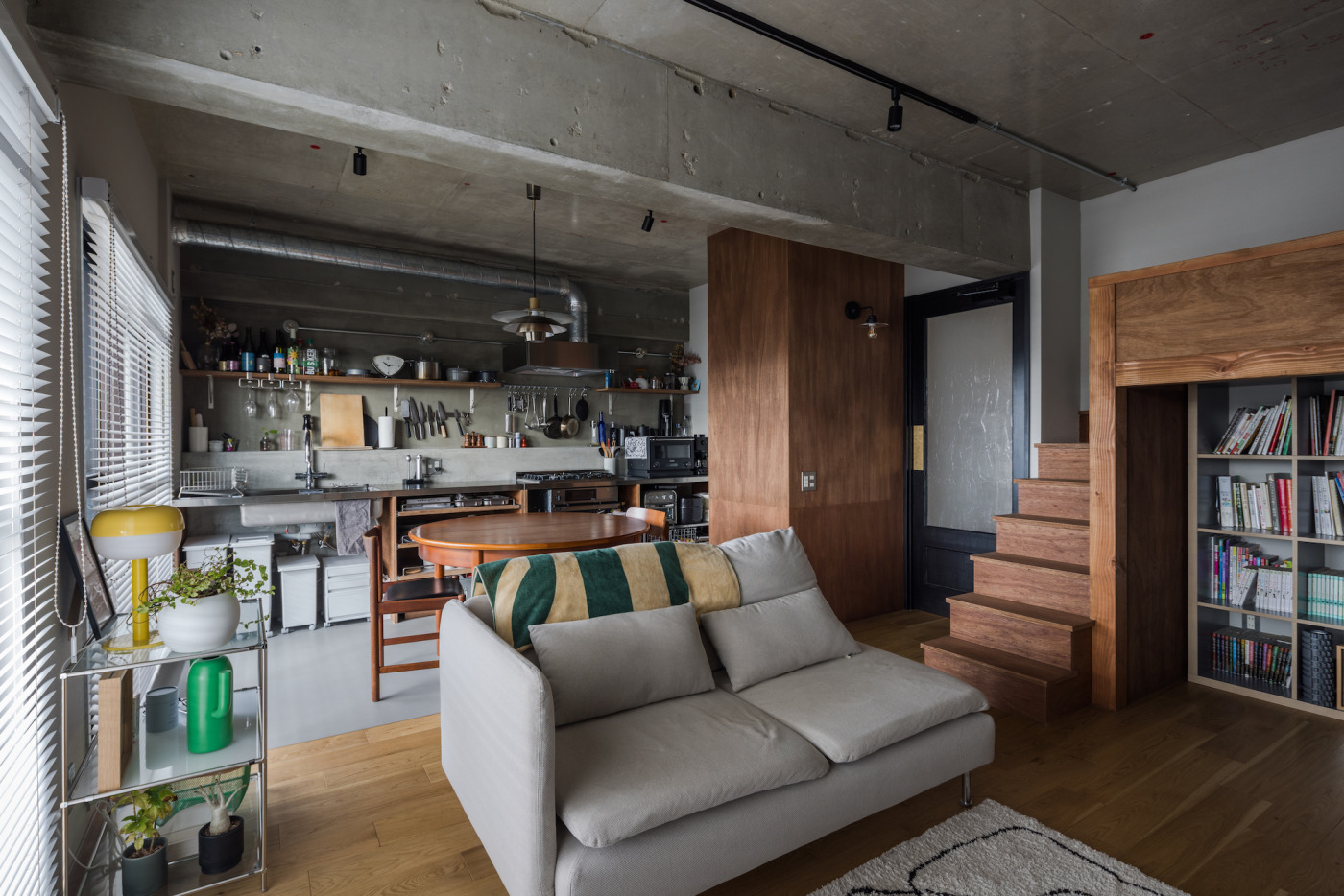 生活の気配がふんわりとにじむ、飾らない空間を目指し、コンクリート打放しの天井や壁など素材そのものの表情を生かしながら、気取らず、自然体で過ごせる住まいにリノベーション。