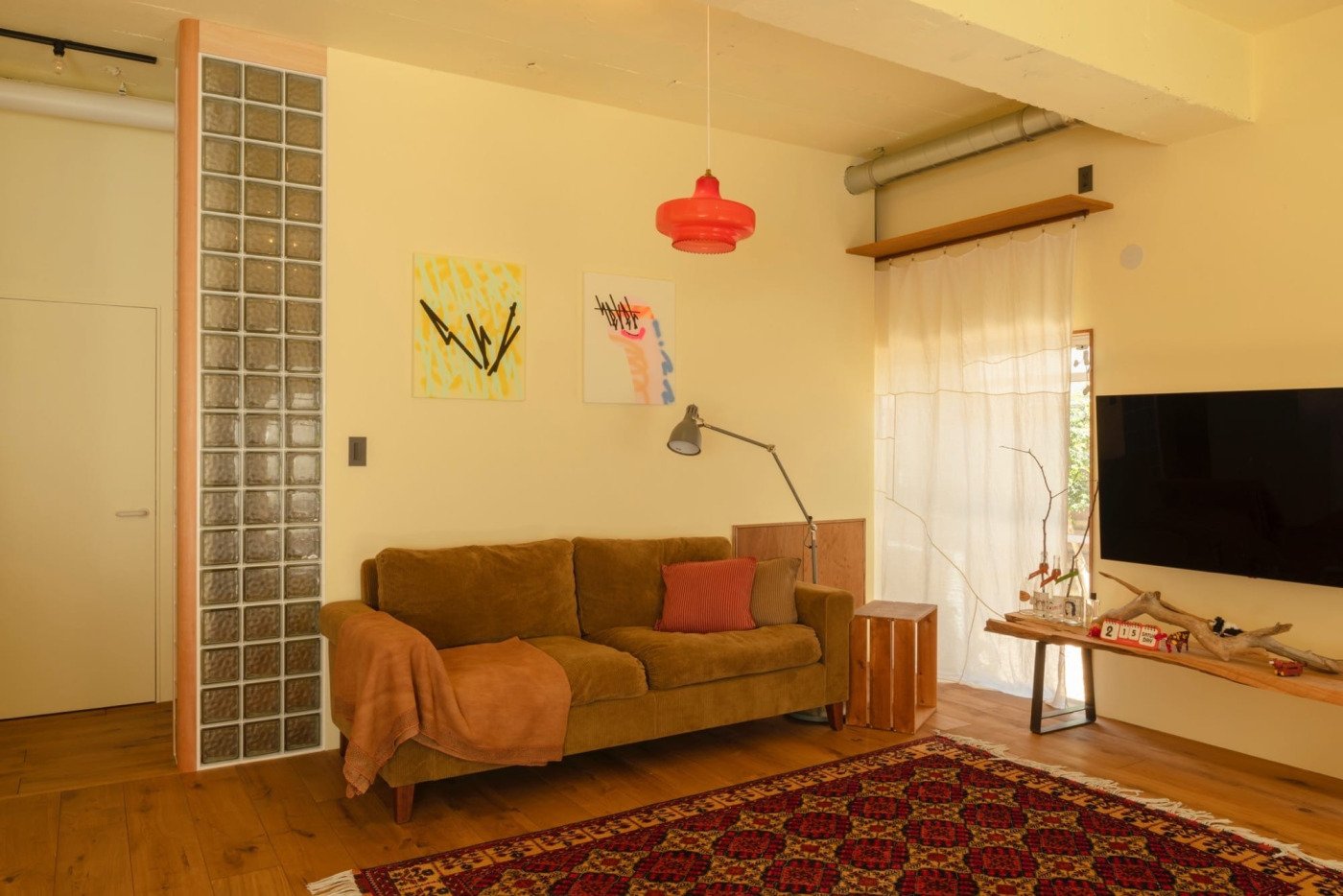 壁面やカーテンレールの上棚など、アートを楽しむ余白を残したリビング。ペンダントライトやスイッチ、ドアノブなどの個性豊かなパーツが空間のスパイスに。