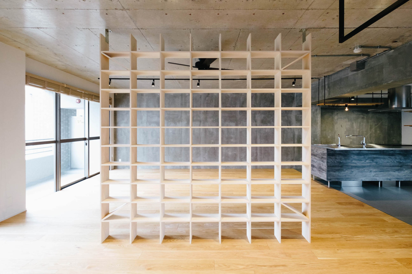 90㎡の3LDKを、贅沢に1LDKへ。間仕切りをなくし、天井までの棚でゆるやかに仕切ることで、開放感のある空間に。