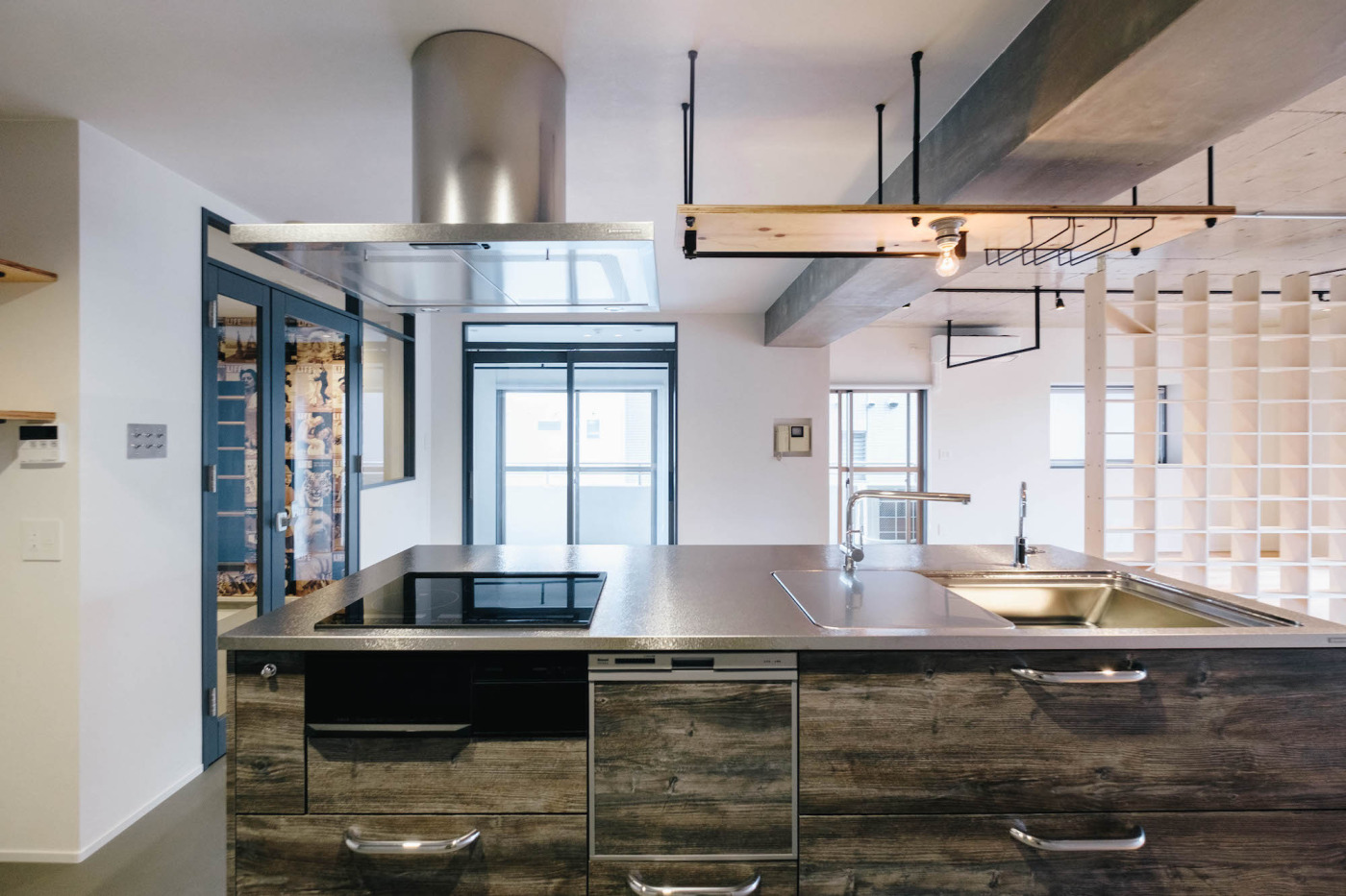 ラフな素材やアイアンの質感を取り入れ、インダストリアルなテイストに仕上げたキッチン。