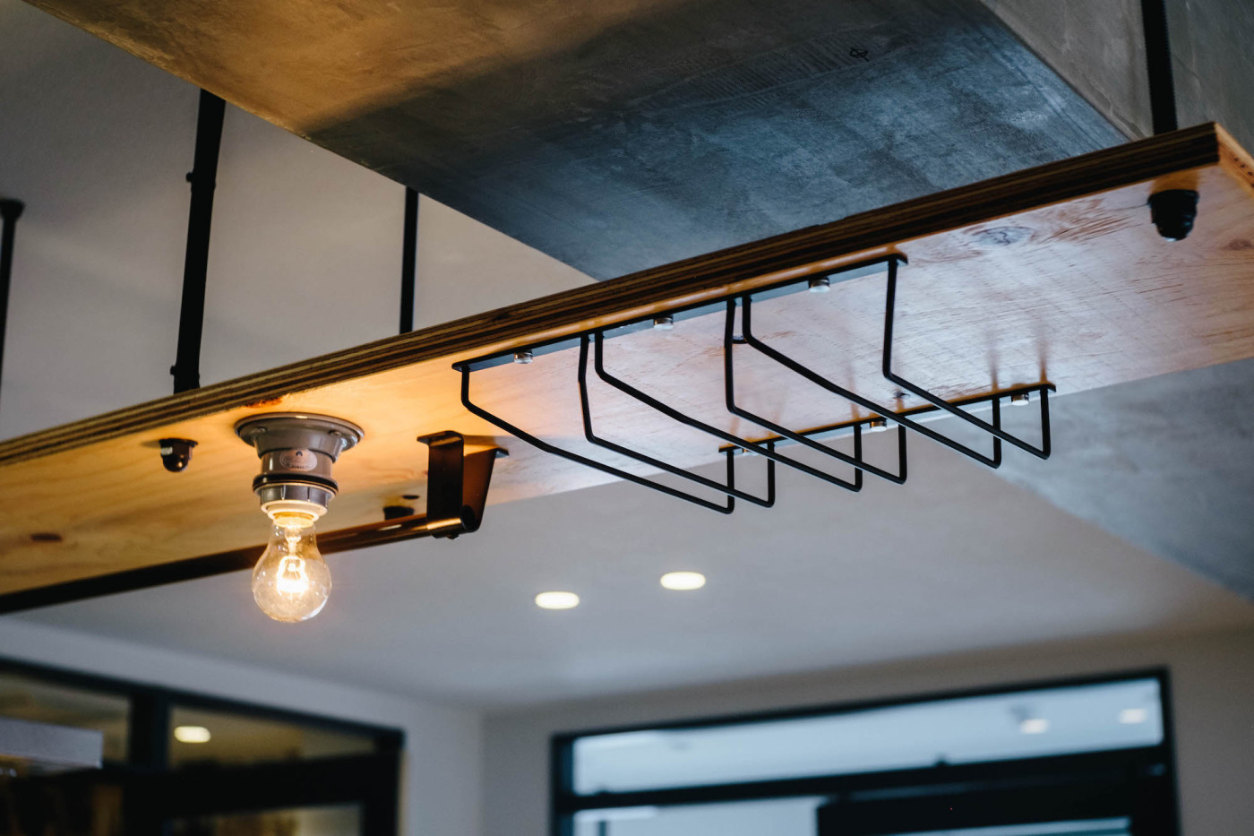 キッチン上に設けた吊り収納は、グラスを掛けてしまえる仕様に。手元灯の工業系レセップが、空間のアクセントになっています。