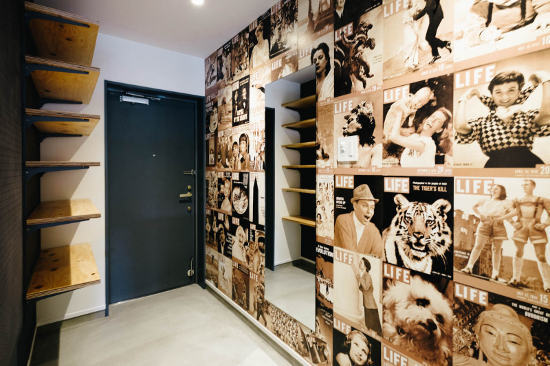 インパクト大な玄関の、雑誌「LIFE」柄のクロスは、お施主さまが手配されたもの。