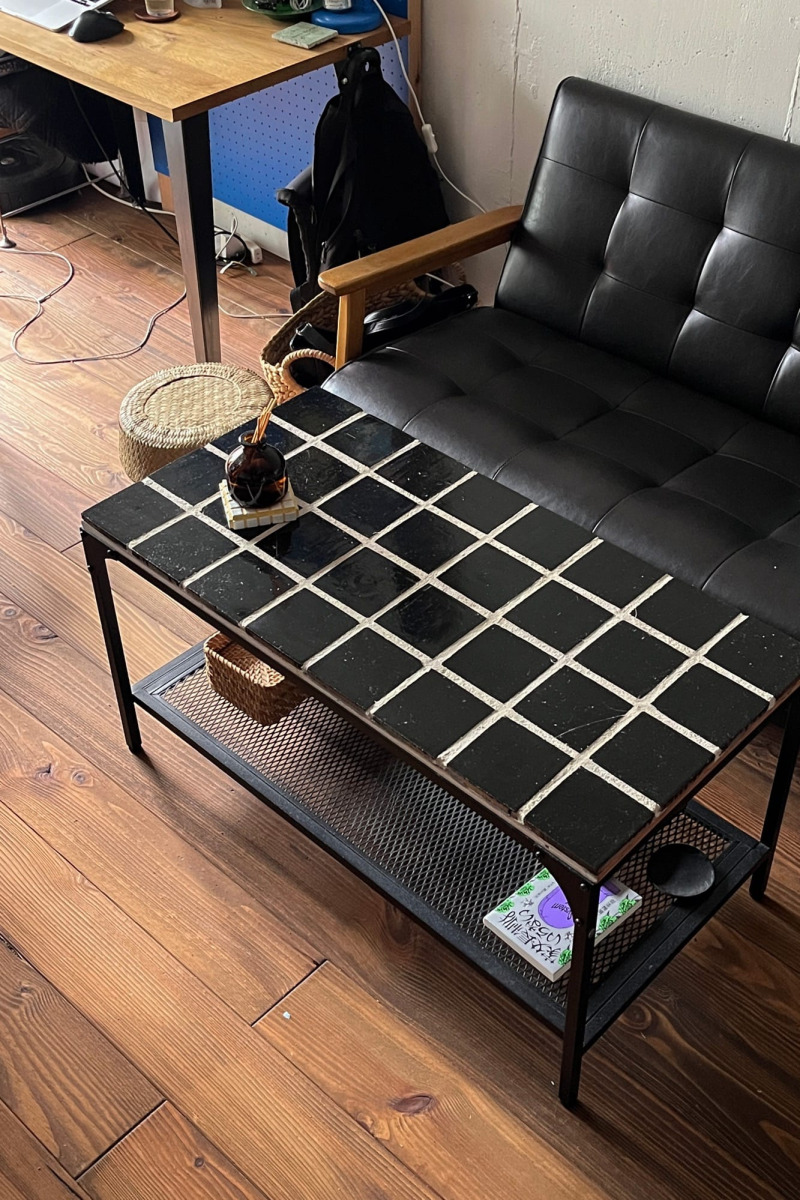 DIYでタイル貼りにした天板。IKEAローテーブルのリメイクアイデアです。