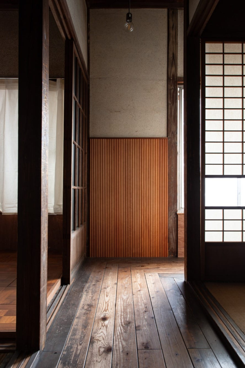 廊下の突き当たりに板壁材でアクセントを。パッと目がむく場所に変わり、絵や写真を掛けてみたいと思わせてくれる。