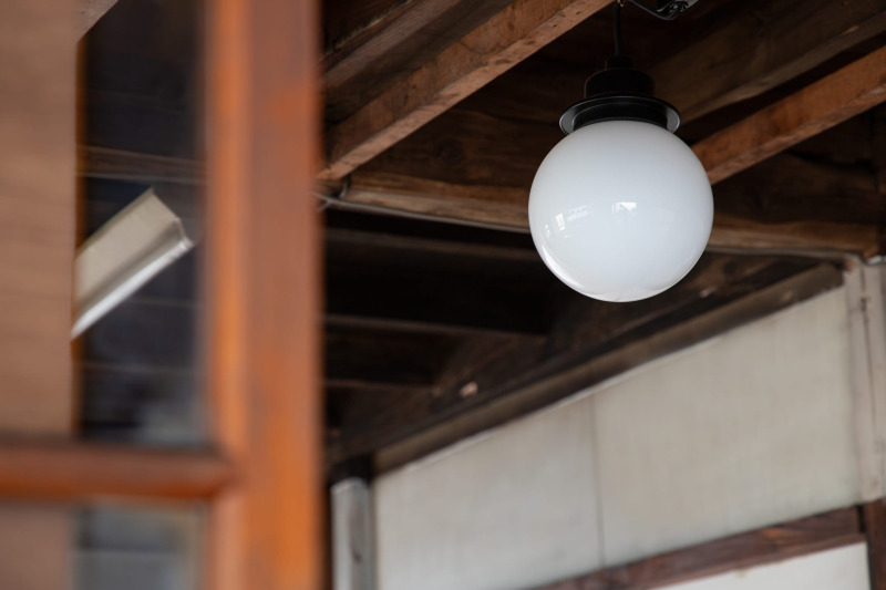 存在感のある「ガラスボール照明」のコードを、短めにオーダー。天井が低い古い建物だからこそ生まれた、絶妙な距離感です。