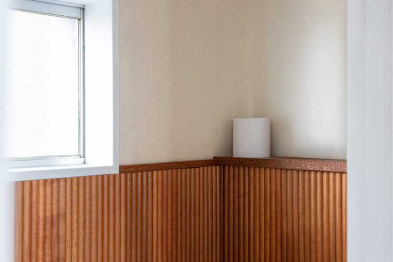 壁の材が切り替わる境界線には、ラワン材の見切りを通して。奥の壁をふかした分、トイレットペーパーのストック置き場が生まれました。