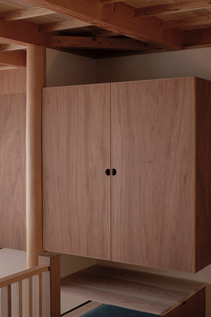 昔ながらの押入れは軽やかに空間に馴染んでいます。たっぷり収納ができる形状はそのままに、少しだけ宙に浮かせることで、空間の広がりを確保しつつ圧迫感も感じさせません。