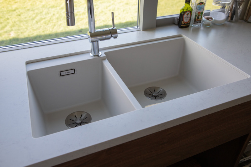 アンダーシンクで『クォーツシンク』のダブルシンクを設置。お菓子づくり専用のシンクとして使えるようにしました。