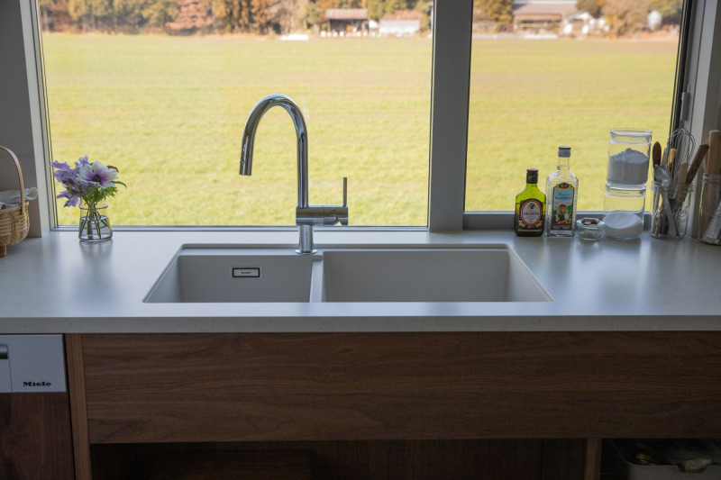 アンダーシンクとして『クォーツシンク』のダブルシンクを設置。窓に向いたキッチンで視線の先には緑が広がる。