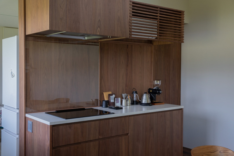 木を基調としたキッチン。『フラットレンジフード』が木で囲まれています。