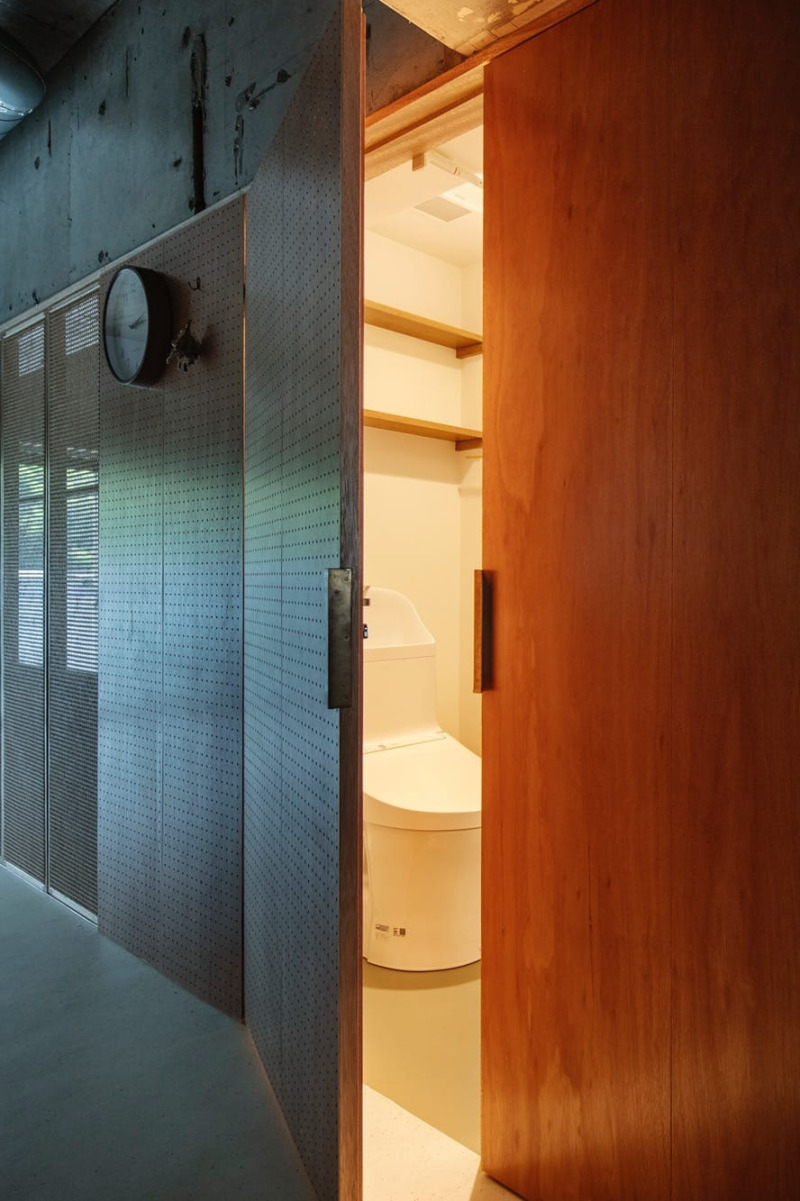一見するとフラットに続く壁。実はトイレへの入り口です。ドアとしての意匠は最小限とし、廊下のラインを美しく保っています。