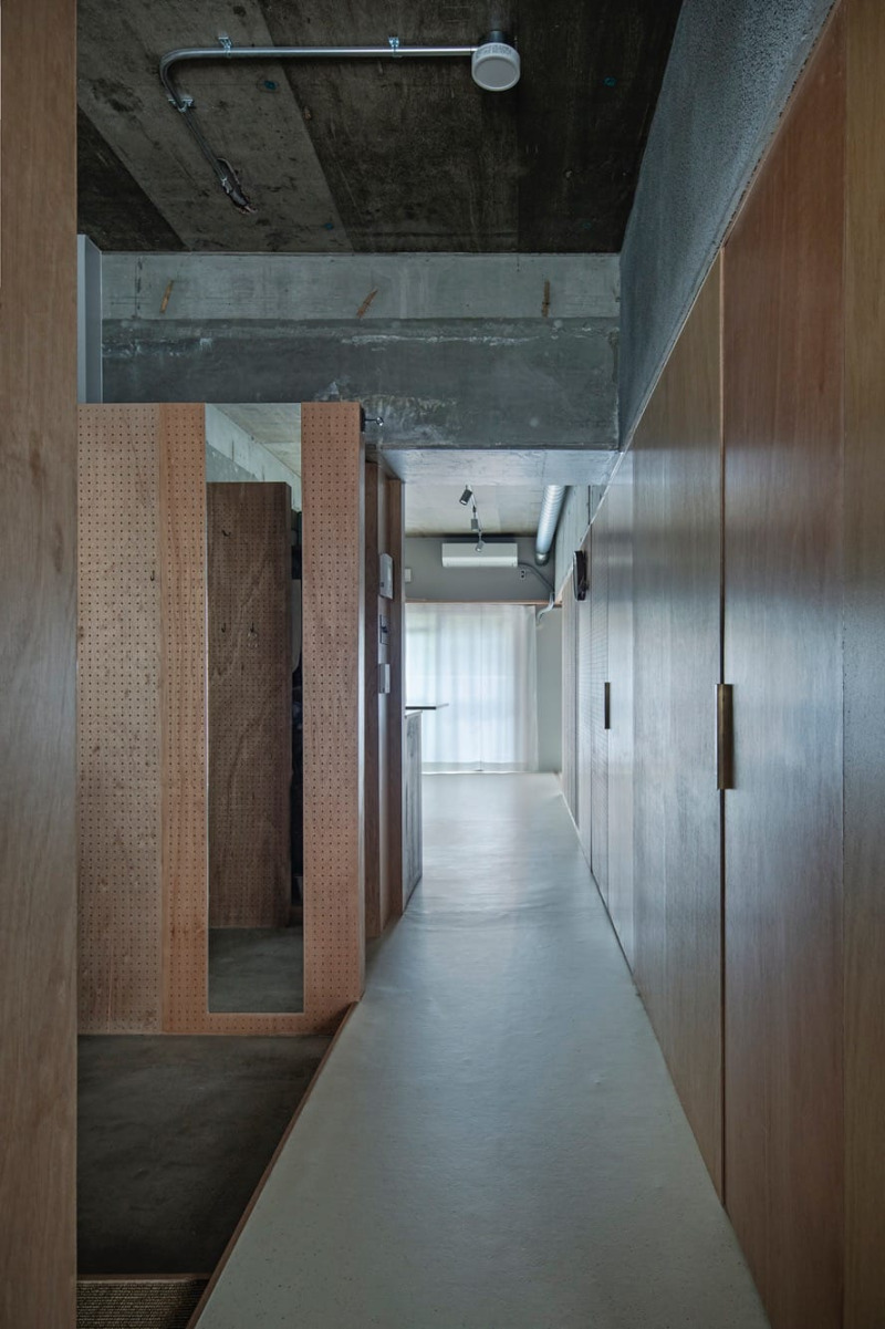 壁の仕上げ材とフラットに仕込まれた姿見。周囲の景色を映し込み、廊下に心地よい奥行きをもたらします。
