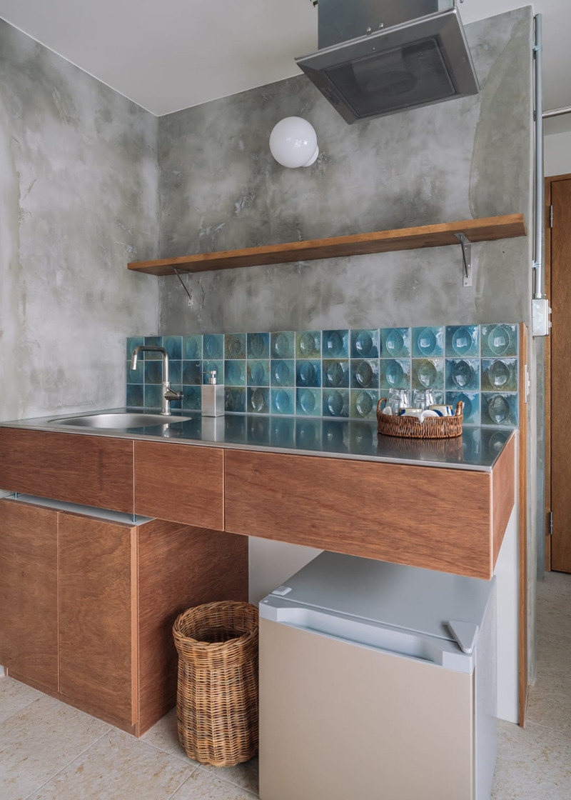 左官仕上げの壁と『木製ミニマルキッチン』の深い色味のコントラストで、タイルの青がより鮮やかに見えます。
