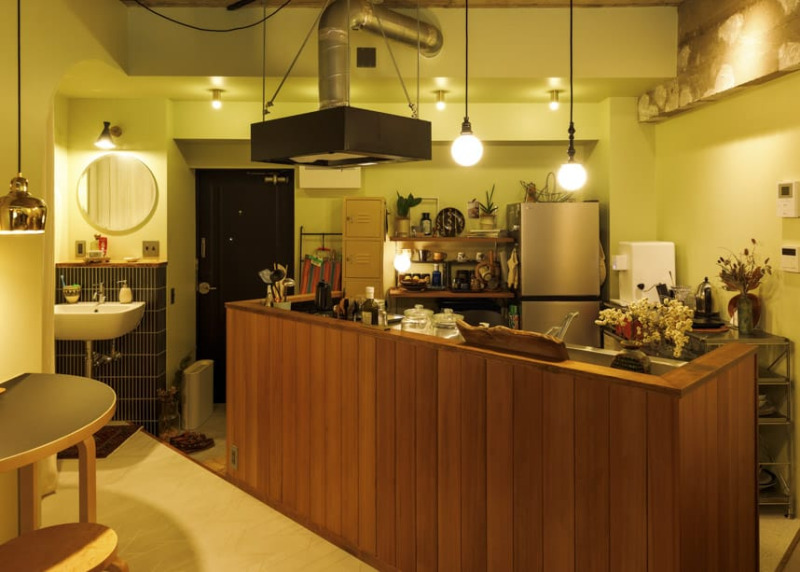 玄関を入ってすぐにある、ワンルーム全体を一目で見渡せるアイランドキッチン。視界を遮らないレンジフードの浮遊感が部屋を広く見せてくれます。