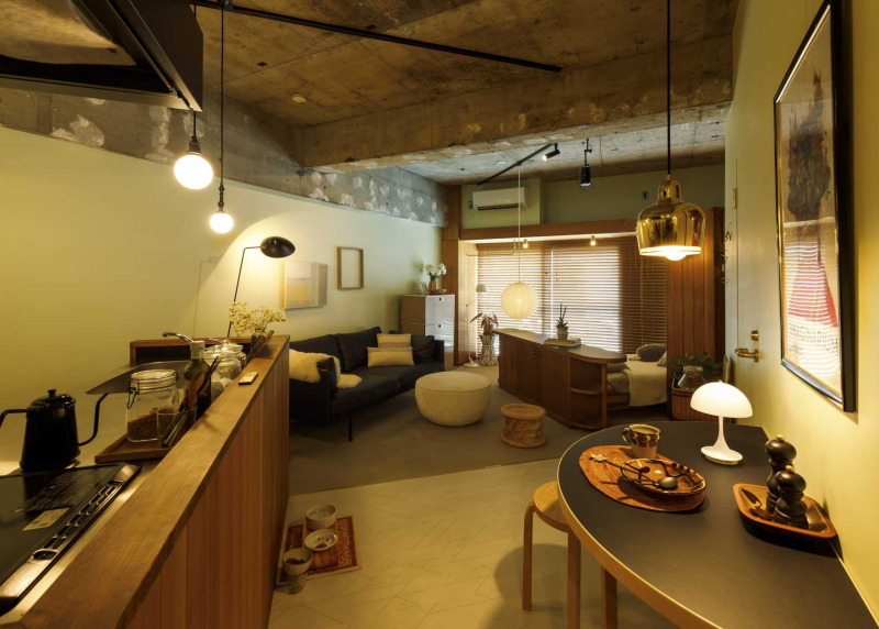 ワンルームを腰壁や造作家具で斜めに区切った空間。視線が多方向に導かれて奥行きを感じます。