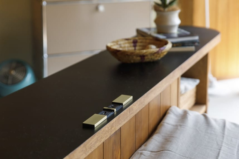 造作ベッドボードの黒い天板には、ゴールドのカバー付きコンセントを設置してアクセントにしています。