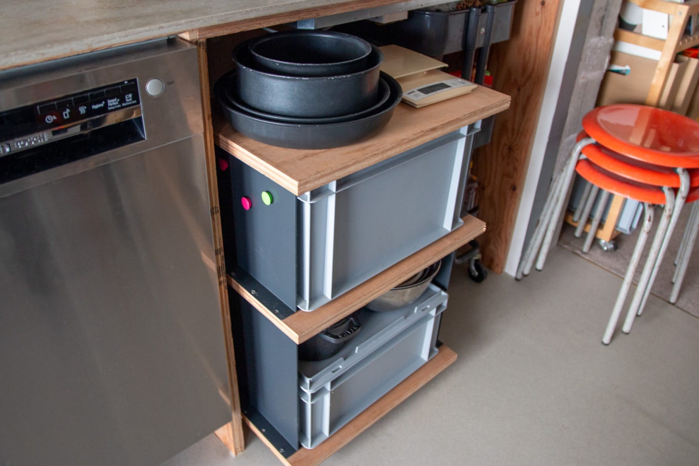 キッチン下は収納を造り付けず、オープンに。しまいたい物にミリ単位で合わせた、ジャストフィットな自作ワゴン。