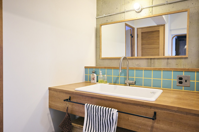 二人で並んで使える広めの洗面台。洗い物もしやすい、大きめの実験用シンクに、キッチンで使われるホースタイプの水栓を合わせて。