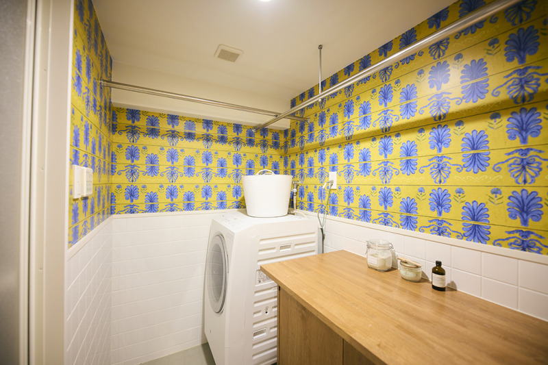 カラフルなクロスで彩った、脱衣所兼ランドリールーム。腰高までは白タイルにすることで、洗濯機の設備感を抑えつつ、柄物のクロスも派手になりすぎないバランスに仕上がっています。