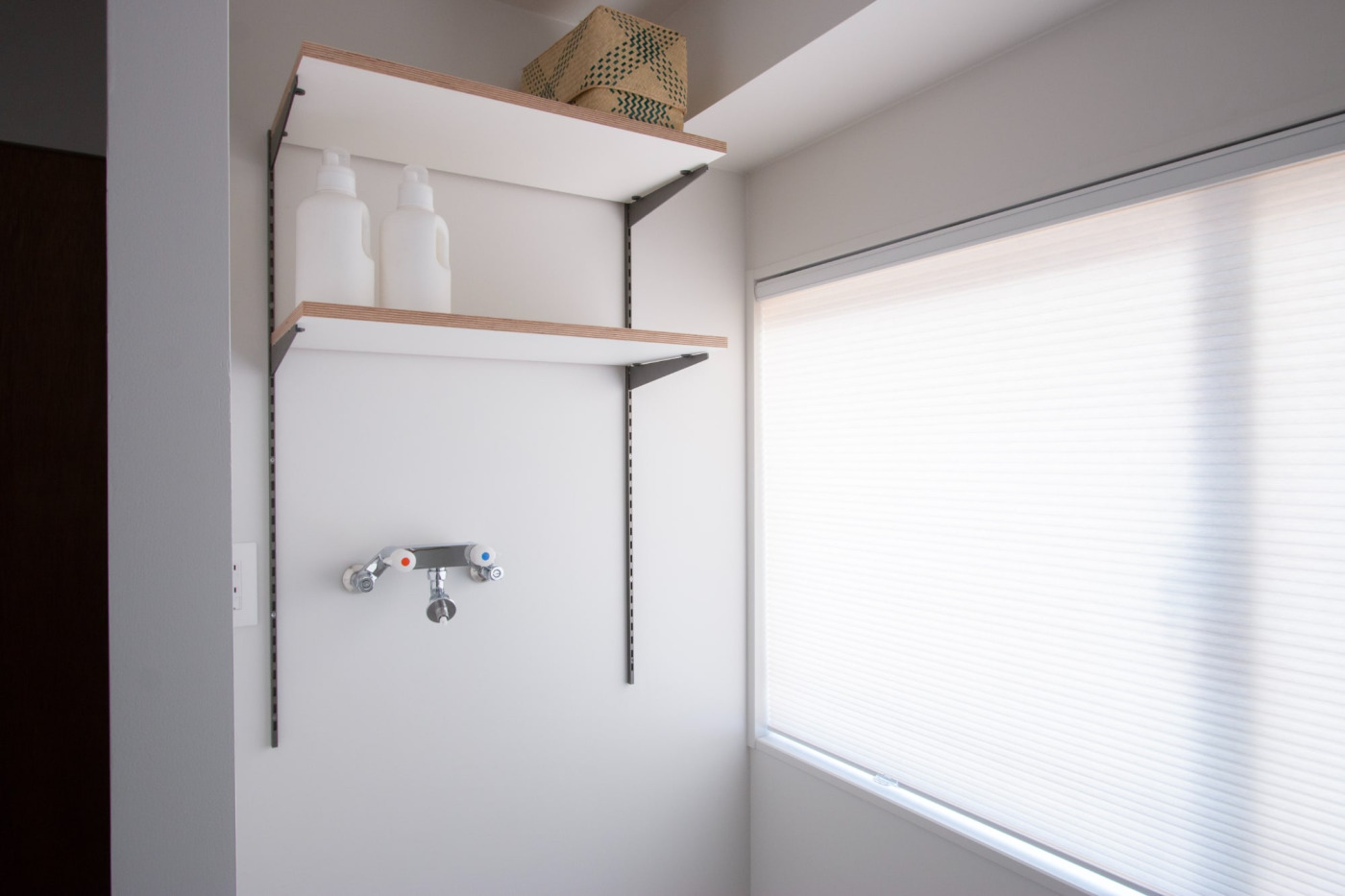 洗濯機上にはラックを取り付けて、洗剤や洗濯用品の置き場を確保。棚受けがスリムな可動収納棚パーツを使って、スッキリとした見た目に。