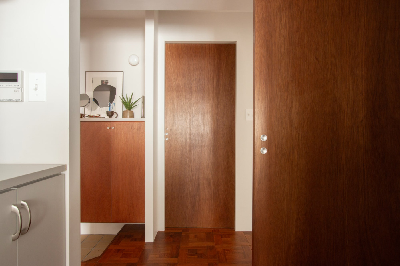 小さな手掛けの光沢が、アクセサリーのように木製引き戸を飾っています。指をかけやすいよう、2つ使い。
