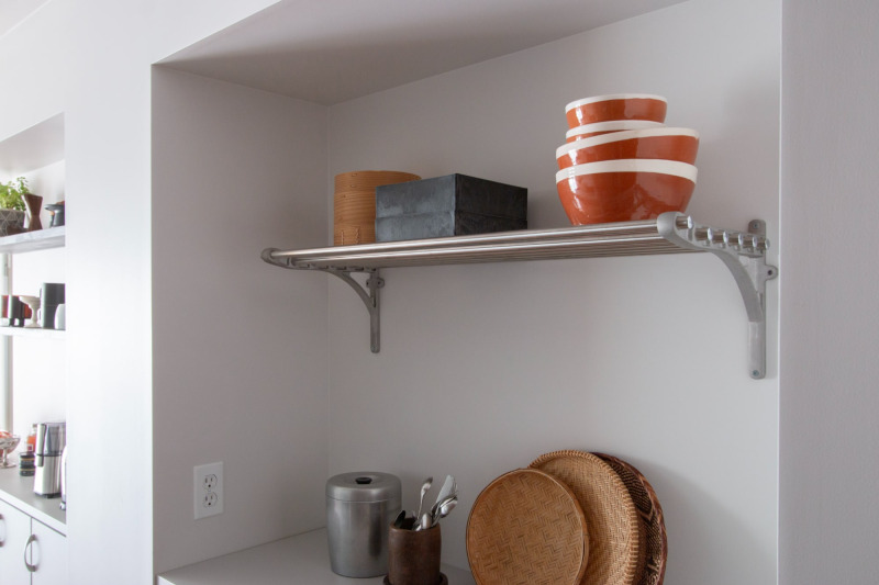 タフなステンレス製のパイプ棚は、鍋を置いたり道具を吊るしたり、気兼ねなく付き合えます。