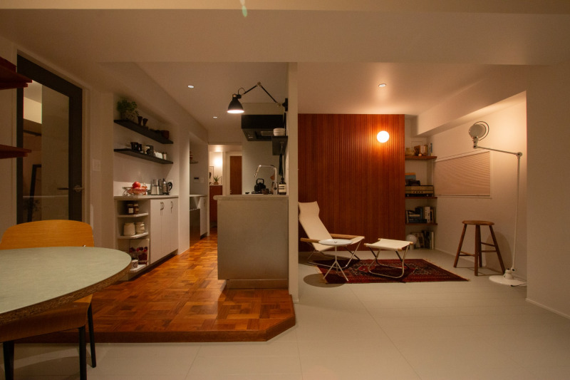 天井には中角のダウンライトを添え、アームライトやブラケットライトで「コーナー感」を高めたLDK。明るすぎない照明計画が、落ち着いた時間を演出します。