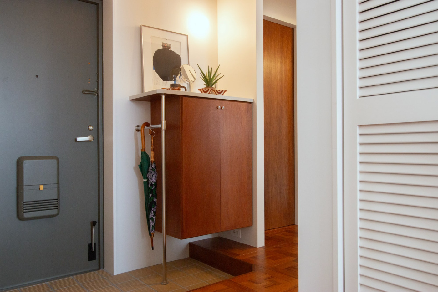 玄関を広く感じさせるため、フロートスタイルにした下足入れ。傘掛けを一体化させたデザインにしています。