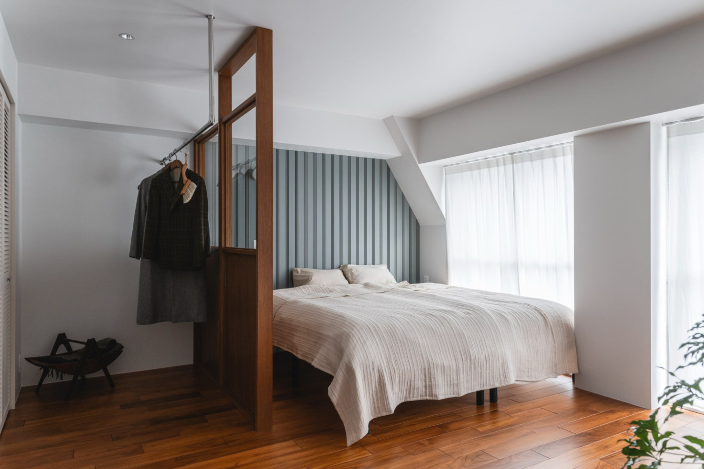 広々とした個室は、ガラス入りの木製パーティションで、寝床におこもり感を演出。グレーにペイントした板壁材もコーナー感を高めています。