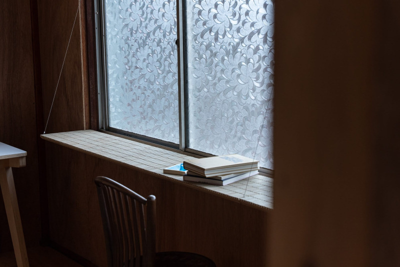窓辺に設けた、タイル天板のデスクコーナー。窓枠に引っ掛けて、ワイヤーで吊ることで、足元スッキリな「脚なしカウンター」に。