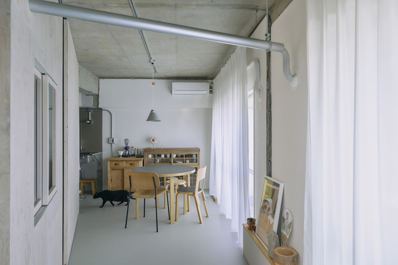 コンクリート躯体現しの天井や壁、既存内装を撤去した跡など、化粧仕上げをされていない状態を活かして空間づくりをしています。