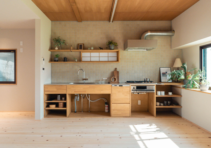 オリジナルで造作したキッチンは、奥さまのこだわりを反映した場所。好きな器をいつでも眺められるように、自然な木の風合いを活かしたオープン棚を中心にデザインしています。キッチン本体は『オーダーキッチン天板』とバーチ材を組み合わせた壁付けスタイルで、横幅もゆったりと、使いやすさと心地よさを両立したキッチンになりました。