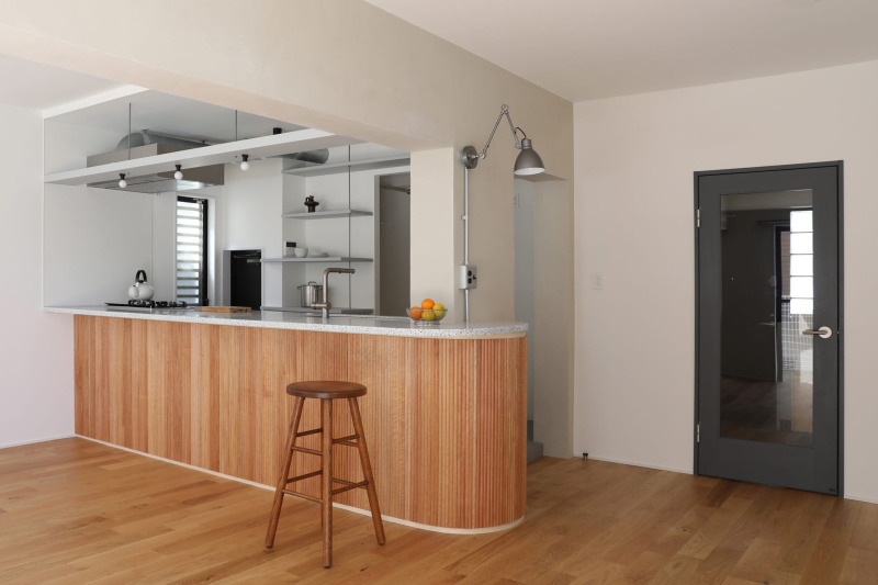 キッチンの腰壁には『クラシックリブパネル』の「チューブ」を貼り上げて、家具らしい見せ方に仕上げています。人工大理石で制作した天板はカーブを描きながらリビング側にも延長させて、カウンターとしての機能も持たせています。