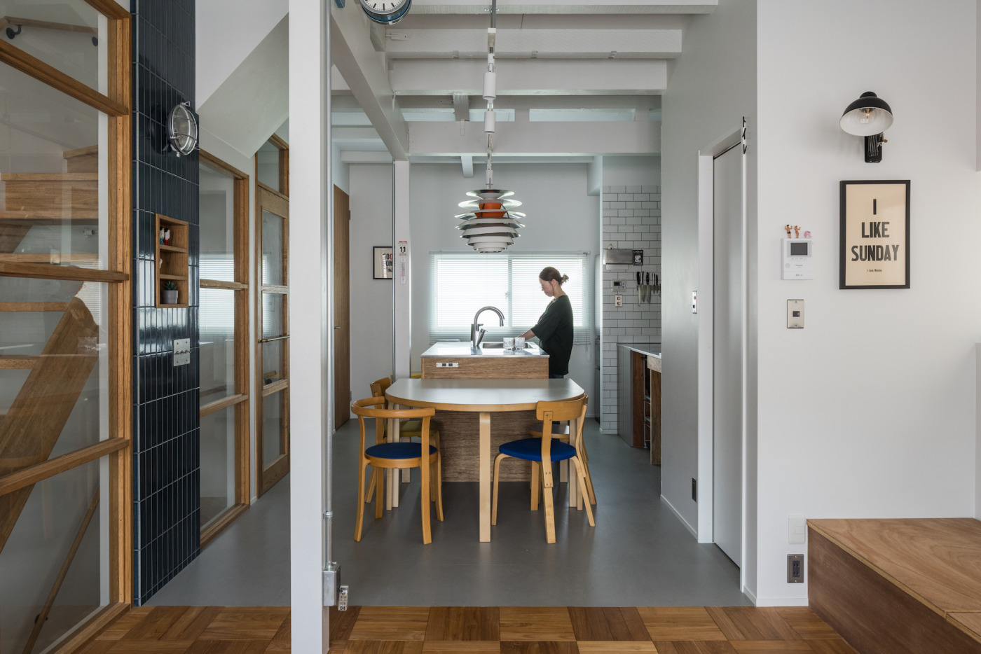壁の一部には『レトロエイジタイル』でアクセントをつけてメリハリを。ミニシェルフは鍵などの小物を置くのにちょうどよく、出掛け際にサッと手に取れる便利さも加わっています。メカニックな表情のスイッチも、さりげないスパイスに。