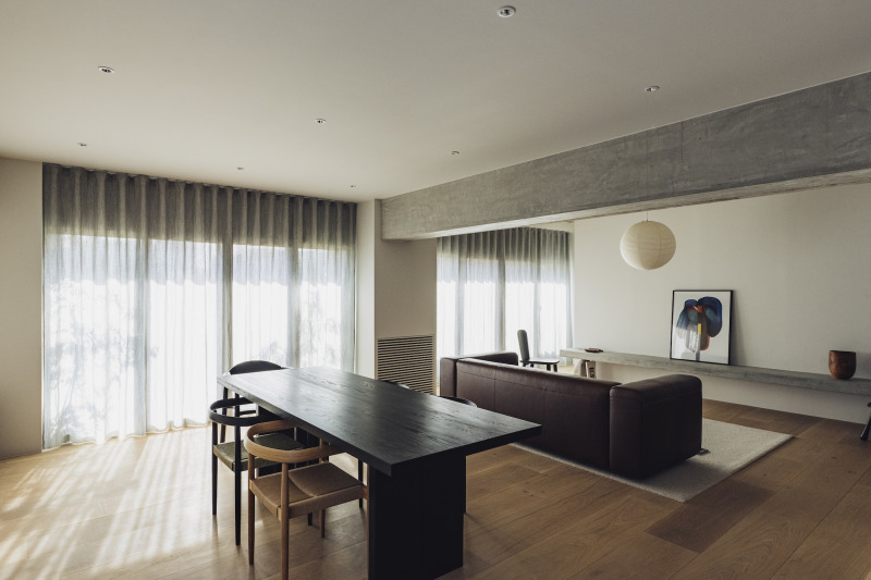 幅広の無垢フローリング、天井から床まで長さを持たせた柔らかなカーテンでゆったりとした雰囲気に仕立てながら、躯体現しの梁やモルタルをアクセントに効かせています。