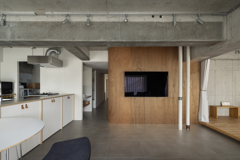 ラワン合板の壁は、角部を曲面にすることで空間にやわらかさと奥行き感をプラス。リビングドアにはクリアガラスの引き戸を採用し、視線の抜けと明るさを保っています。